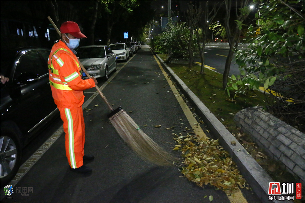 来自湖南的田朝胜,在清洁工人这个岗位已经工作10年,每天清晨他都在清扫着这个片区路面,地面上泛黄的叶子在黑夜里被他扫的沙沙作响。他说,疫情期间,很多环卫人员回老家后再想回深圳就没那么容易了,有很多老乡被隔离了回不来。“希望咱们的日子赶快好起来吧,2020年一天比一天过得好。”田朝胜感慨到。
