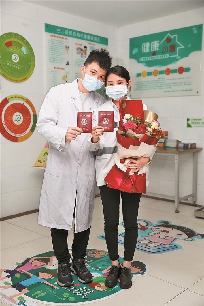 “其实我们最初选定领结婚证的日子是2月2日,但当时正值抗击疫情的紧张时期,我和爱人都在抗疫一线紧张忙碌,根本没有时间考虑领证的事情。”钟玉连说。她和爱人曾焕文都是1994年出生的,两人是师兄妹,也是抗疫一线的医务人员。钟玉连是龙岗区坂田卫生监督分所(预防保健所)疾控科的骨干,曾焕文是光明区合水口社康中心的一名医生。对于决定推迟领结婚证一事,他们表示“双方互相都特别理解,毕竟工作还是第一位的。”