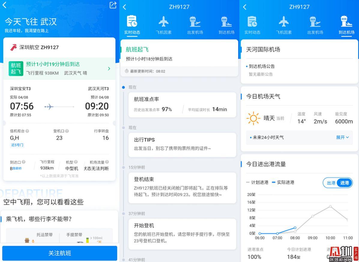 见圳客户端·深圳新闻网2020年4月8日讯(见圳客户端、深圳新闻网记者 张喆 陈致远 钟鸿冰)4月8日7时55分,深圳航空ZH9127航班从深圳宝安国际机场起飞。这是自武汉市解除离汉离鄂通道管控措施后,从深圳机场飞往武汉的首架客运航班。