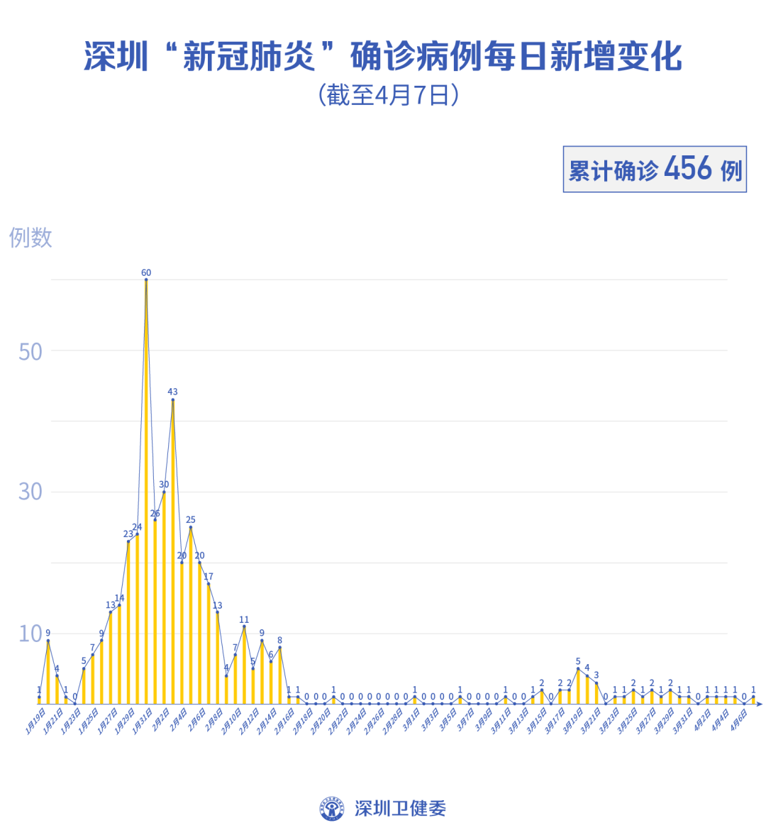 截至4月7日24时,深圳累计报告新冠肺炎病例456例。4月7日当天新增境外输入病例1例,新增无症状感染者1例,出院1例。