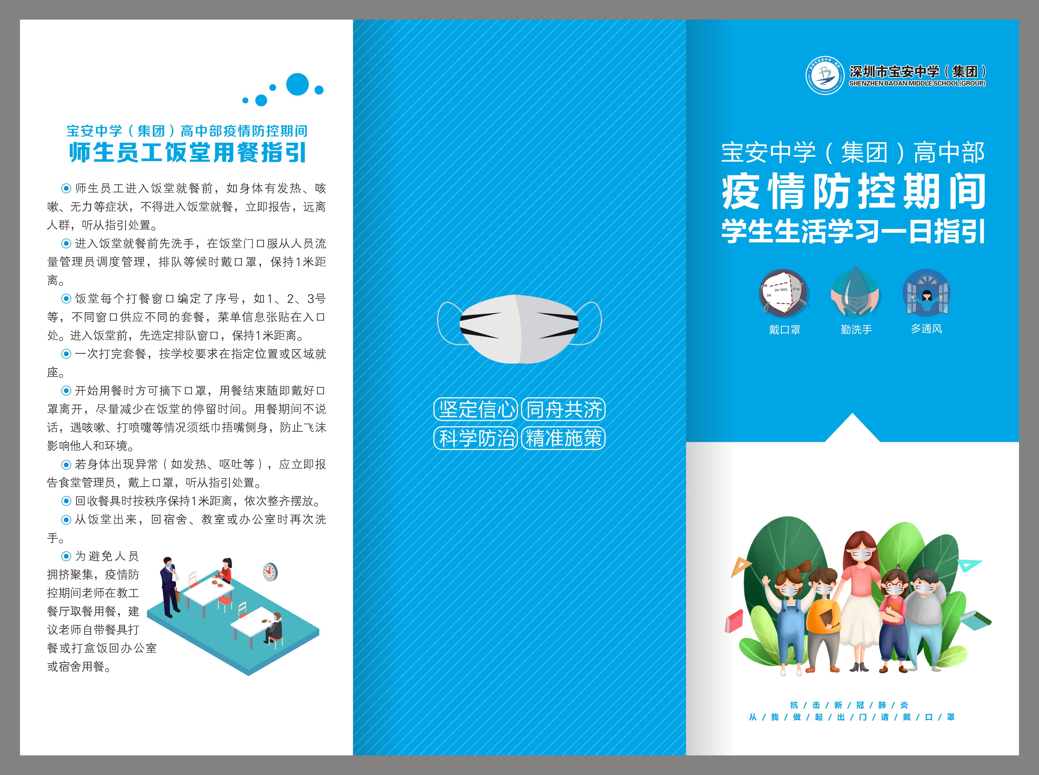 早在3月,返校复课的相关准备工作就已经在紧锣密鼓地推进中。为了规范师生返校复课各项措施和要求,在深圳市教育局发布复课防控疫情工作指引之前,彭锻华就结合疫情形势变化与学校实际,提出制定宝中集团的《学生学习生活一日指引》《教师工作生活一日指引》,对在校师生每天各个 时段 、各个 地点 的学习、工作和生活做出了明确指引。