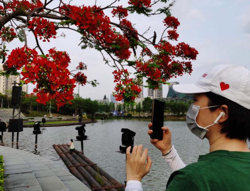 凤凰木又名火树、红花楹,由于其开花时"叶如飞凰之羽,花若丹凤之冠",因而得名「凤凰树」。每年5月至7月,是凤凰树开花的时节。在鹏城公园、道路两旁到处可见凤凰花盛开,当下凤凰花开正灿烂,锦簇花团红似火,成为鹏城亮丽的风景线。图为龙岗大运中心凤凰树花开吸引市观赏拍照。