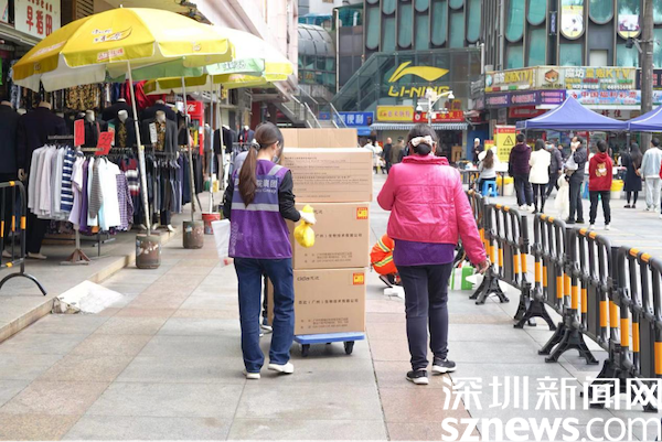 据悉,在市、区指挥部领导下,东门街道成立了专项疫情防控指挥部,设置11个工作组。全街道共设置了8个临时核酸检测点和2个防控区内人员核酸检测点,开展全员核酸检测工作。在核酸检测点,检测通道分为绿码与黄码通道,现场工作有序开展,居民自觉遵守规定,间隔一米排队。罗湖医院集团工作人员,正在运送补给物资。