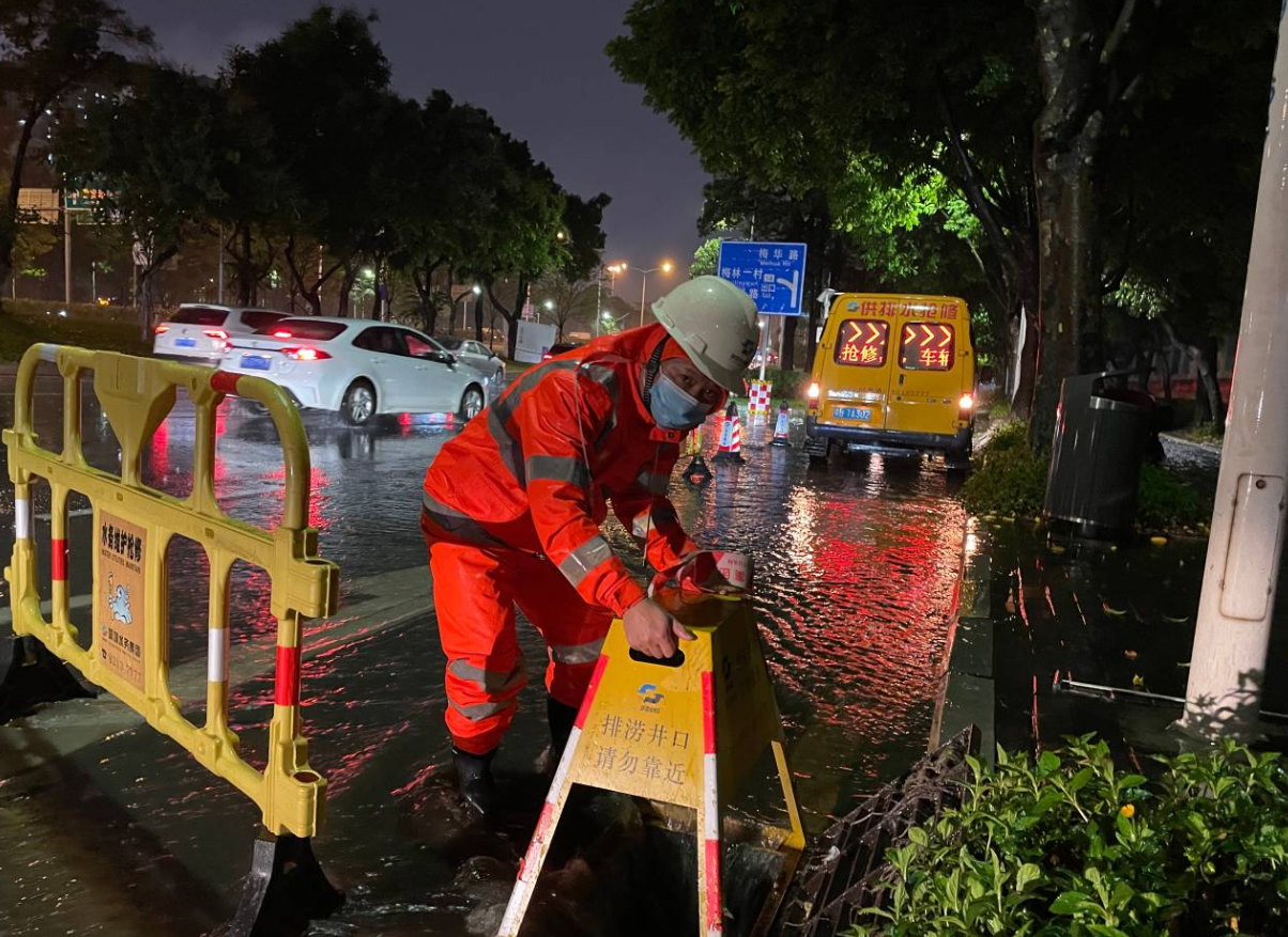 深圳环水集团福田分公司员工坚守在北环立交梅秀路口易淹点,打开雨水篦子加速排水。(深圳新闻网记者 潘润华 通讯员 陶柳)