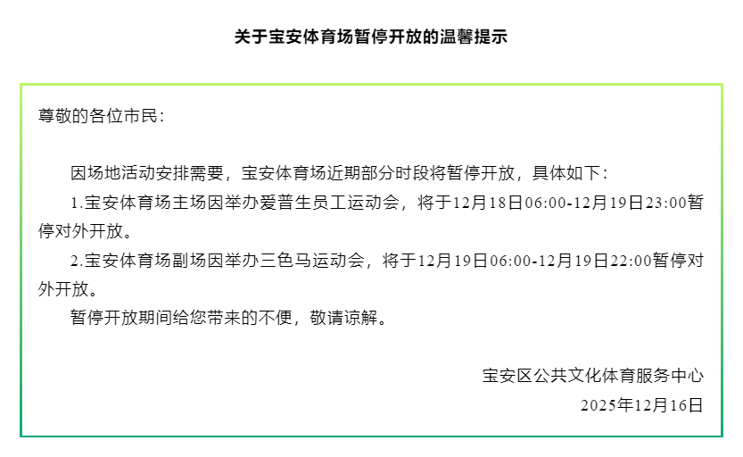 ● 宝安:因场地活动安排需要,宝安体育场近期部分时段将暂停开放。