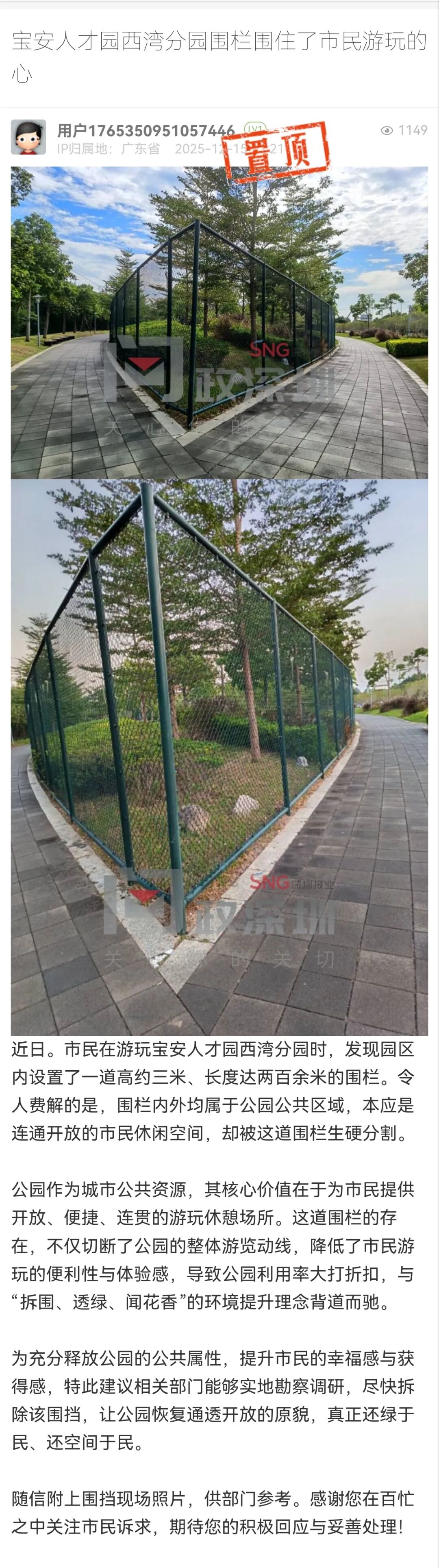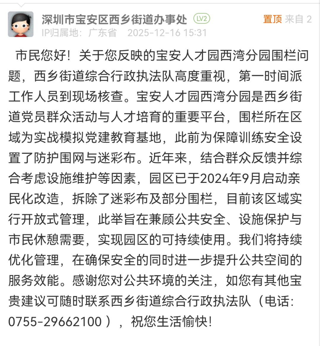 ● 网友发帖称“宝安人才园西湾分园围栏围住了市民游玩的心”,最新回应:已第一时间派工作人员到现场核查。