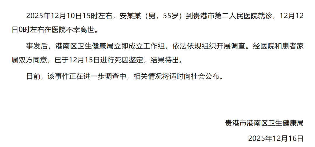 ● 广西港南通报“男子肺炎住院两天突发躁狂离世”:立即成立工作组调查,已进行死因鉴定,结果待出。
