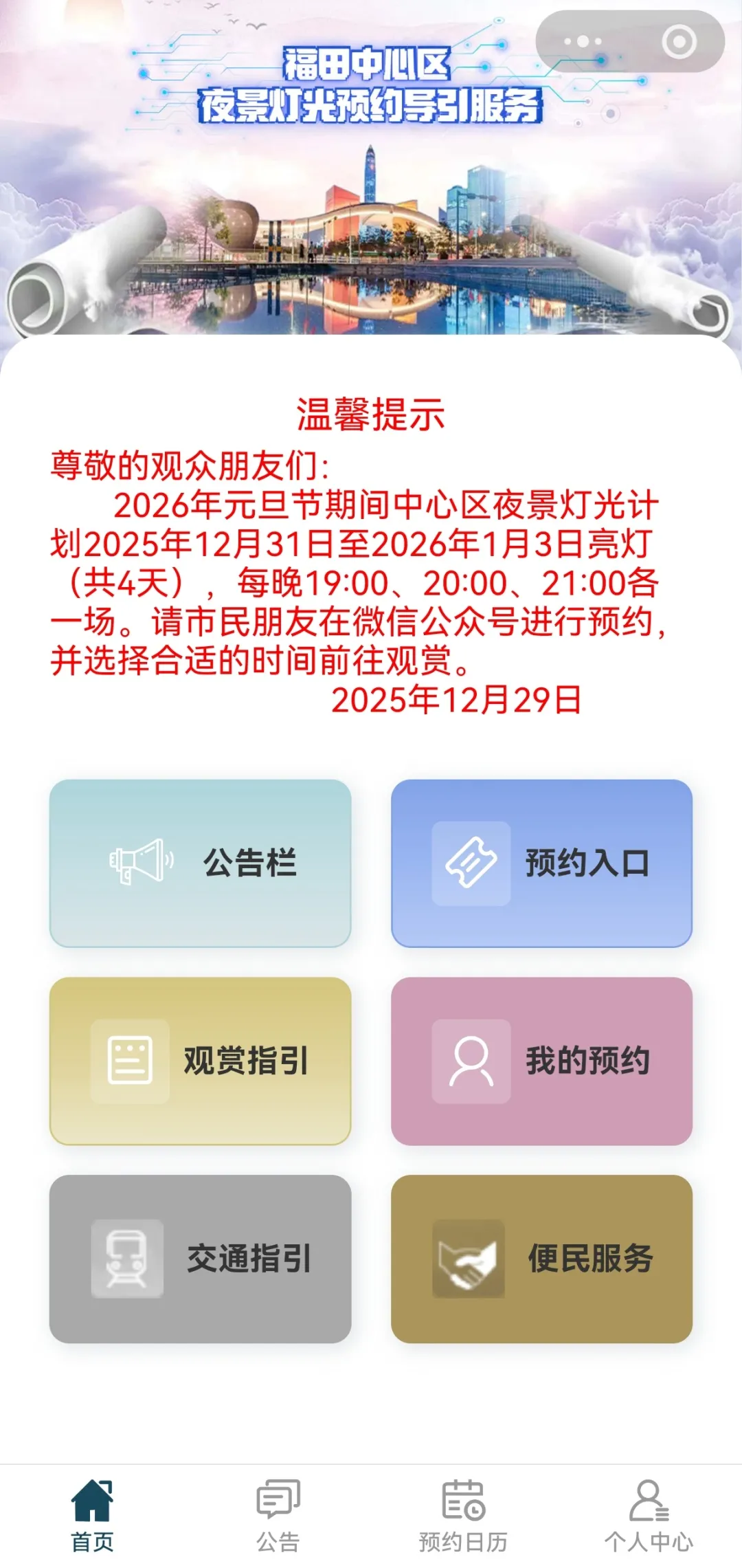 ● 2026年元旦节期间福田中心区夜景灯光计划2025年12月31日至2026年1月3日亮灯(共4天),每天19:00、20:00、21:00各一场。