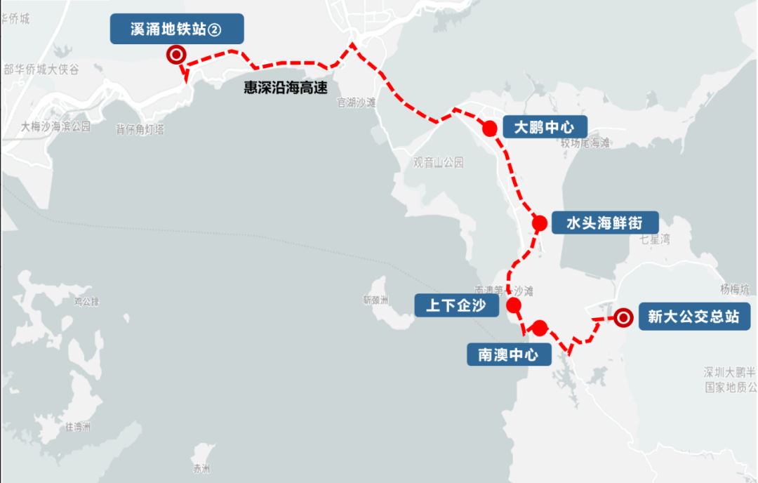 新大公交总站、上下横岗、南澳中心①、上下企沙、南澳办事处、水头海鲜街、中国农科院深圳基因组所、布新社区、大鹏新区妇幼保健院、王母围、大鹏中心①、迎宾北路西、溪涌盐村、溪涌度假村、溪涌小学、溪涌地铁站②(上行);溪涌地铁站①、迎宾北路西、大鹏中心①、王母围、大鹏新区妇幼保健院、布新社区、中国农科院深圳基因组所、水头海鲜街、南澳办事处、上下企沙、南澳月亮湾、上下横岗、新大公交总站(下行)