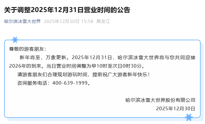 ● 哈尔滨冰雪大世界发布关于调整2025年12月31日营业时间的公告。