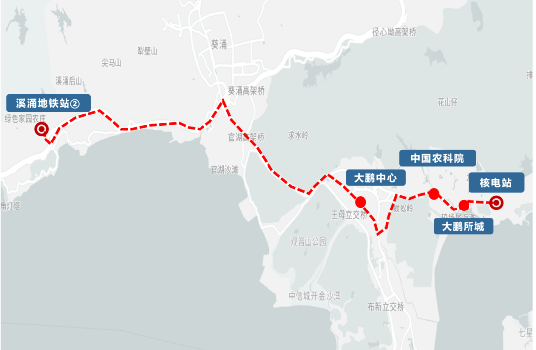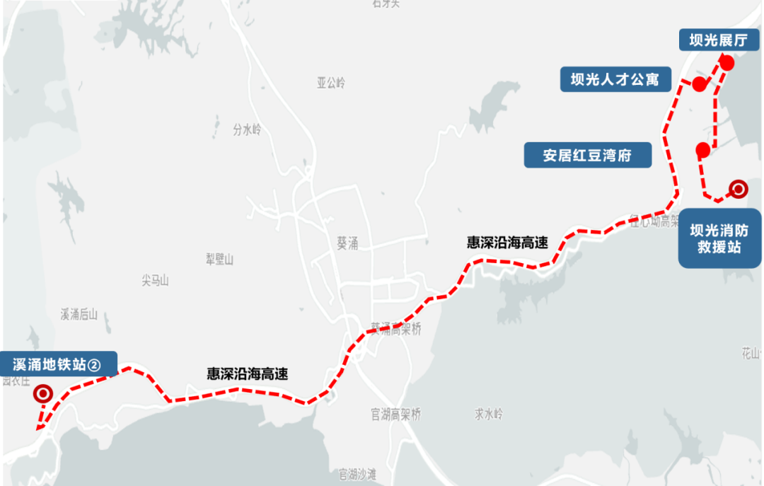 坝光消防救援站、排牙山鑫科路口、安居红豆湾府、坝光展厅、坝光人才公寓、溪涌盐村、溪涌度假村、溪涌小学、溪涌地铁站②(上行);溪涌地铁站①、坝光人才公寓、坝光展厅、葵湾生物谷路口、排牙山鑫科路口、坝光消防救援站(下行)
