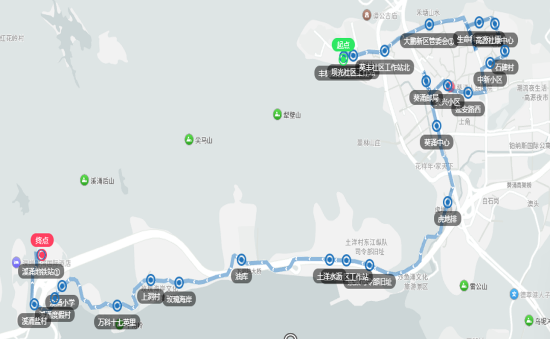 丰树山公交首末站、坝光社区工作站、葵丰社区工作站北、大鹏新区管委会①、生命科学产业园、高源社康中心、石碑村、中新小区、延安路西、葵兴小区、葵涌邮局、葵涌中心、虎地排、东纵司令部旧址、土洋社区工作站、土洋水沥、油库、玫瑰海岸、上洞村、万科十七英里、溪涌小学、溪涌度假村、溪涌盐村、溪涌地铁站① (上行);溪涌地铁站①、溪涌盐村、溪涌度假村、溪涌小学、万科十七英里、上洞村、玫瑰海岸、油库、土洋水沥、土洋社区工作站、东纵司令部旧址、虎地排、葵涌中心、葵涌邮局、葵兴小区、延安路西、中新小区、石碑村、高源社康中心、生命科学产业园、大鹏新区管委会①、葵丰社区工作站北、坝光社区工作站、丰树山公交首末站(下行)