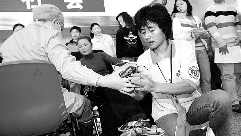 “深圳献血女状元”高敏在捐血现场协助医生工作