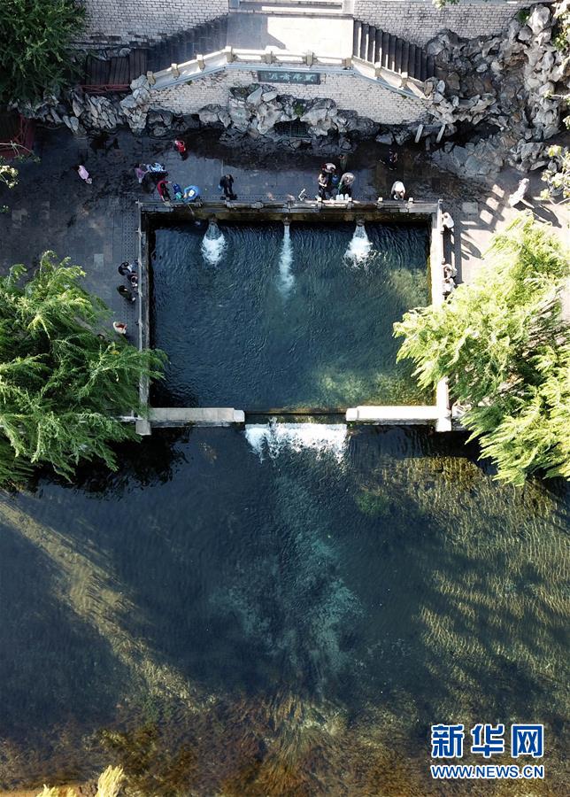 9月30日,游客在免费开放的济南市黑虎泉游览(无人机拍摄)。近年来,山东积极推进国有景区免费开放工作,截至目前,山东实现免费开放的国有景区已达286处。新华社记者徐速绘摄
