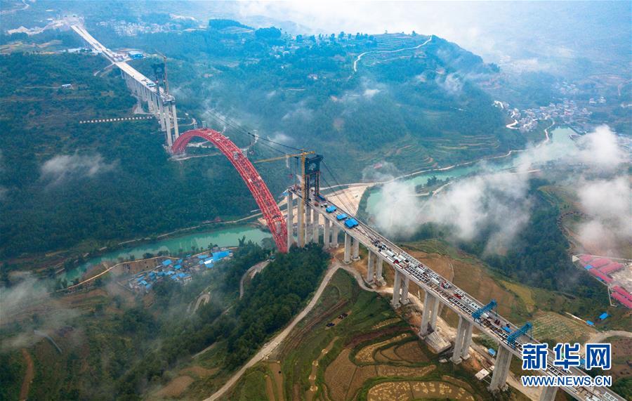 9月12日使用无人机拍摄的大小井特大桥。 目前,横跨在贵州省罗甸县大井河上的大小井特大桥建设进入冲刺阶段。大小井特大桥全长1.5公里,主跨450米,是世界最大跨径上承式钢管混凝土拱桥。据了解,该桥是平塘至罗甸高速公路关键性工程,对打通贵州“断头路”,助推滇黔桂石漠化片区脱贫攻坚具有重要意义。 新华社记者刘续摄