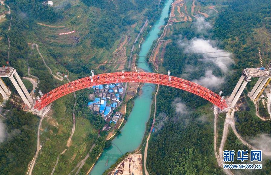 9月12日使用无人机拍摄的大小井特大桥。 目前,横跨在贵州省罗甸县大井河上的大小井特大桥建设进入冲刺阶段。大小井特大桥全长1.5公里,主跨450米,是世界最大跨径上承式钢管混凝土拱桥。据了解,该桥是平塘至罗甸高速公路关键性工程,对打通贵州“断头路”,助推滇黔桂石漠化片区脱贫攻坚具有重要意义。 新华社记者刘续摄