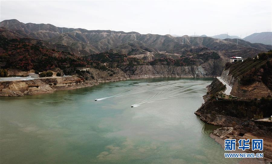 10月24日,两艘快艇从刘家峡水库库区驶过(无人机拍摄)。 新华社记者 陈斌 摄
