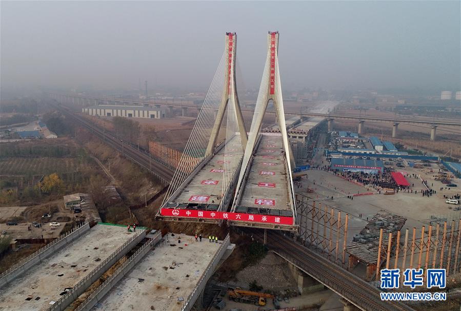 10月25日,唐山市二环路项目上跨津山铁路斜拉桥在转体中(无人机拍摄)。 当日,河北省唐山市二环路项目上跨津山铁路斜拉桥转体成功。据介绍,该桥总长927.5米,主桥由斜拉转体桥和转体T构桥组成,转体总重5.1万吨,其中斜拉转体桥重3.3万吨,主塔高达80.5米,为曲线变截面“双人字”形空心塔,自上而下共有128根斜拉索。 新华社记者杨世尧摄