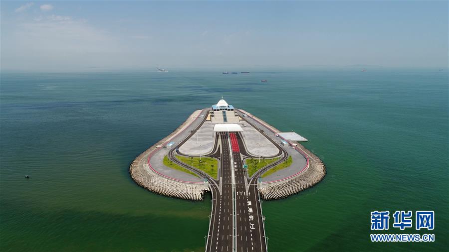 从港珠澳大桥东人工岛遥望西人工岛,中间是海底隧道(2018年7月11日无人机拍摄)。 金秋十月,伶仃洋上海天一色、潮声阵阵,依傍着这片中国南海水域的城市群迎来深具意义的一天。 10月23日上午,港珠澳大桥开通仪式在广东珠海举行,中共中央总书记、国家主席、中央军委主席习近平出席仪式,宣布大桥正式开通。 碧波之上,一桥飞架香港、澳门、珠海三地,以气贯长虹的“中国跨度”,飞越沧海百年的历史风云,展现当代中国的雄健风采。 新华社记者梁旭摄