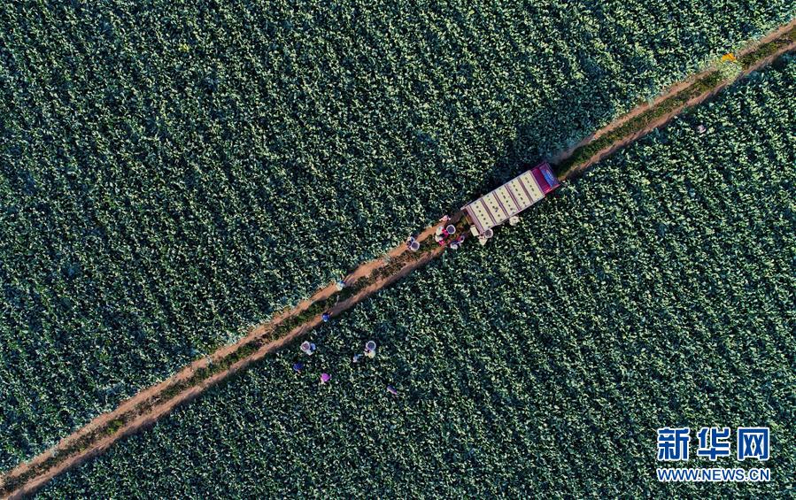 10月29日,乐亭县马头营镇马头营村的农民在收获菜花(无人机拍摄)。 新华社记者杨世尧摄