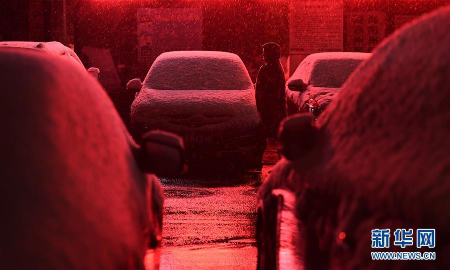 在青海省西宁市,一名外卖配送员冒雪骑行(11月3日摄)。 11月3日,青海省西宁市等地迎来降雪。 新华社记者 吴刚 摄