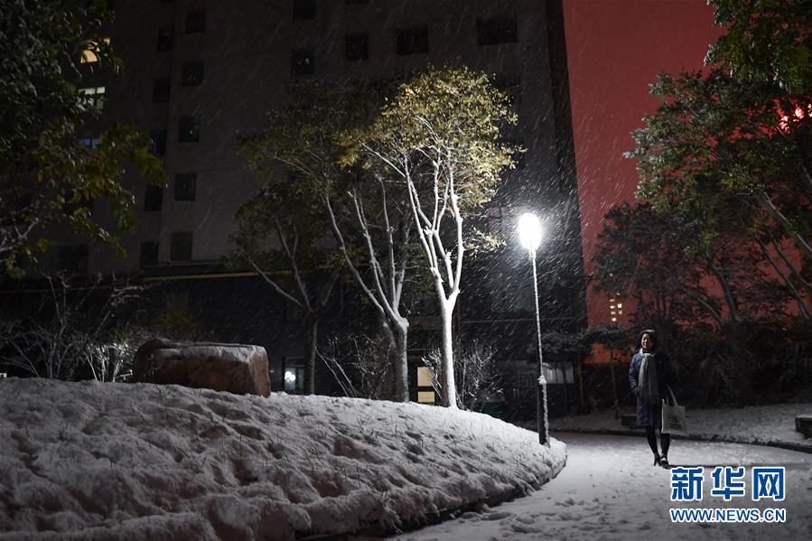 在青海省西宁市一小区内,一名市民在院内前行(11月3日摄)。 11月3日,青海省西宁市等地迎来降雪。 新华社记者 吴刚 摄