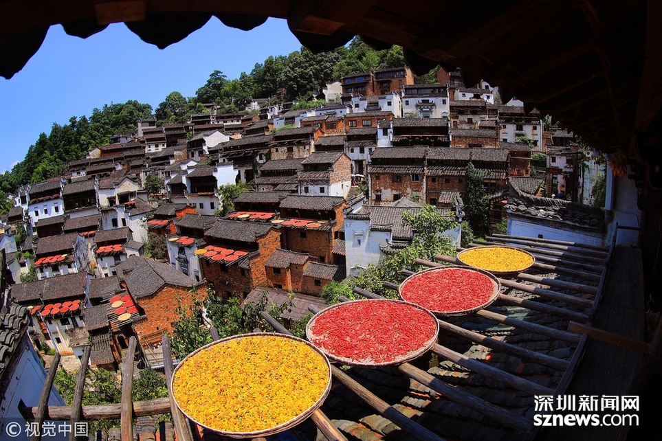 2018年8月7日,江西婺源县篁岭古村,壮观的“晒秋”场景。 深圳新闻网讯 2018年8月7日,江西婺源县篁岭古村落,壮观“晒秋”场景。当日立秋节气,江西婺源县篁岭古村的农作物普遍丰收,村民们又迎来了一年一度的“晒秋”季。村民们将收获来的红辣椒、玉米、南瓜、稻谷和菊花等色彩斑斓的农作物,晾晒在依山而建的徽派民居房前屋后的木制晒架上,在秋日阳光的照射下,色彩缤纷圆圆的晒扁,铺就在错落有致的徽派民居之间,格外璀璨夺目,蔚为壮观。目前,“篁岭晒秋”已经成为中国乡村旅游的一张名片。