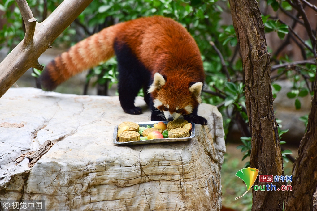 2016年09月15日,在山东烟台动物园,一只小熊猫在吃特制的水果“月饼”。
