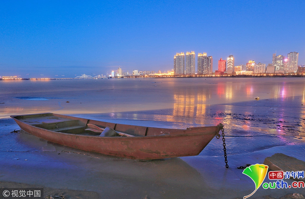 松花江封江 冰面如镜倒影冰城夜景
