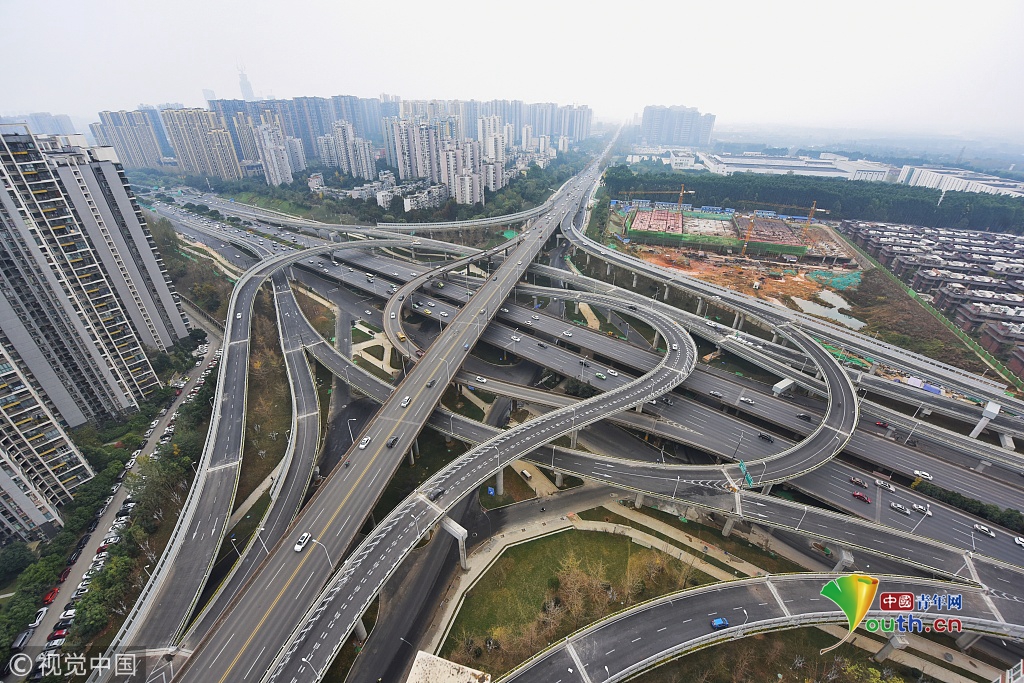 2018年11月23日,成都,俯瞰整个娇子立交的全貌:12条匝道已经完工,道路标线、路面路况、指示牌都是全新的,不时有车辆在三环路和成龙路之间转换。