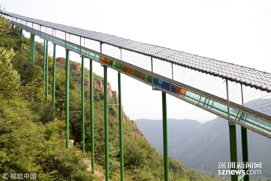 2018年8月11日,郑州,双排高空玻璃滑道亮相伏羲山三泉湖景区,整条滑道从高空俯视,呈龙形蜷曲姿态俯卧于玫瑰岭下。