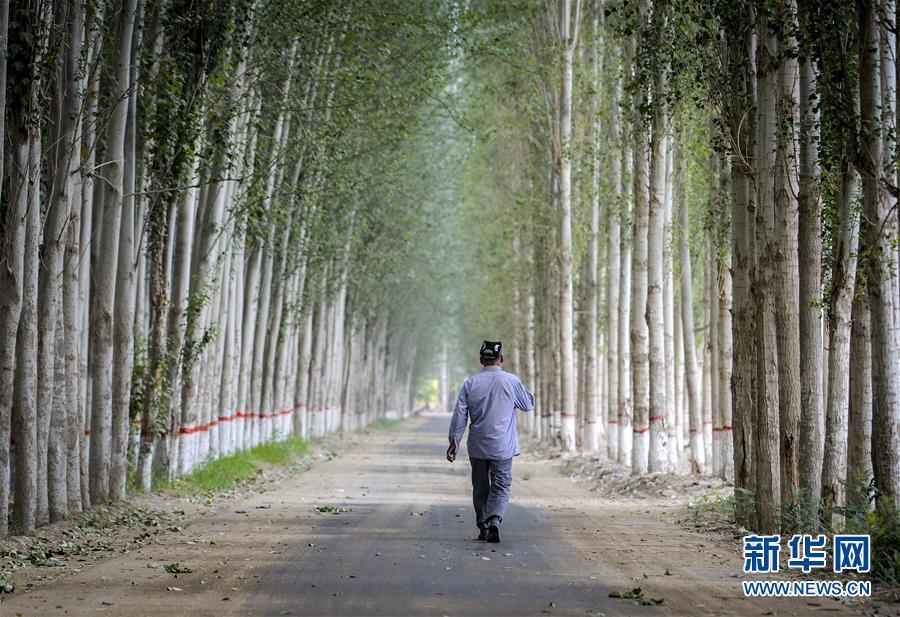 在新疆和田市伊力其乡依盖尔其村,如则托合提·如孜走在乡间小路上(6月6日摄)。 新华社记者 赵戈 摄