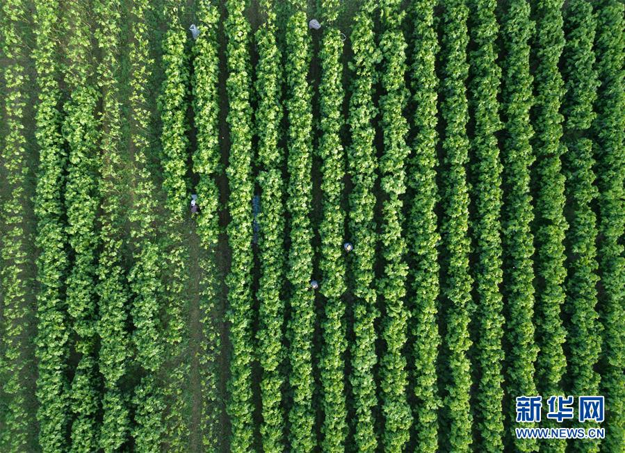 养蚕工人在下姜村采摘桑叶(5月9日无人机拍摄)。
