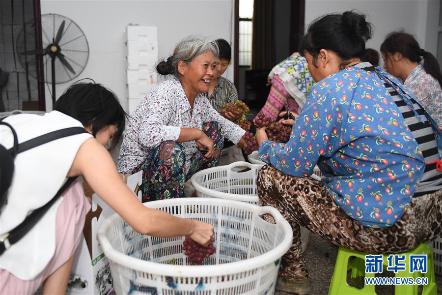 下姜村村民将刚采摘的葡萄挑拣装箱(2017年8月9日摄)。下姜村用流转的土地建成葡萄园、草莓园、茶叶园、中药材园等产业园区,村民收入实现了“节节高”。