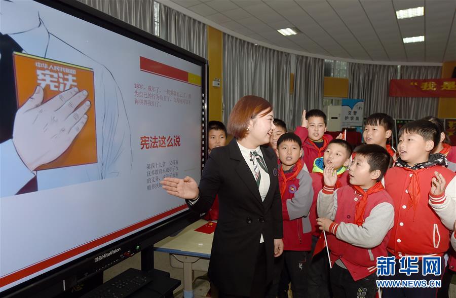 12月3日,合肥市经开区明珠居委会法律援助律师在给明珠小学的学生们讲解宪法知识。国家宪法日到来之际,各地学校纷纷举办主题宣讲活动,对学生开展法治教育,帮助孩子们了解宪法知识。新华社记者 郭晨 摄
