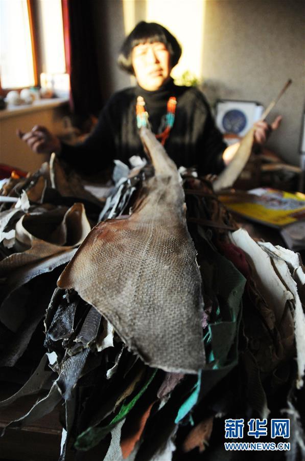 张琳的工作室堆满了鱼皮(2011年11月28日摄)。国家级非物质文化遗产赫哲族鱼皮制作技艺是我国赫哲族传统手工艺术。作为这项技艺的黑龙江省级传承人,十余年来,张琳一直从事鱼皮画的研究和创作,并通过做推广、开讲座、办活动,让更多年轻人了解并喜欢上这一传统手工艺,将这项濒临失传的艺术更好地传承下去。新华社记者 王凯 摄