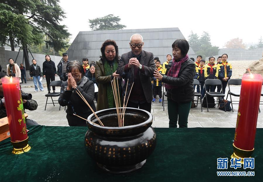 12月3日,南京大屠杀幸存者余昌祥(前排右二)率家属祭拜被侵华日军杀害的亲人。 当日,在第五个南京大屠杀死难者国家公祭日到来之际,南京大屠杀死难者遗属家祭活动在侵华日军南京大屠杀遇难同胞纪念馆正式启动。首批前来开展家祭活动的南京大屠杀幸存者余昌祥、石秀英老人分别率家属在纪念馆内的死难者名单墙前献花、敬香、跪拜,并诵读家信,表达对亲人的哀思。 新华社记者 孙参 摄