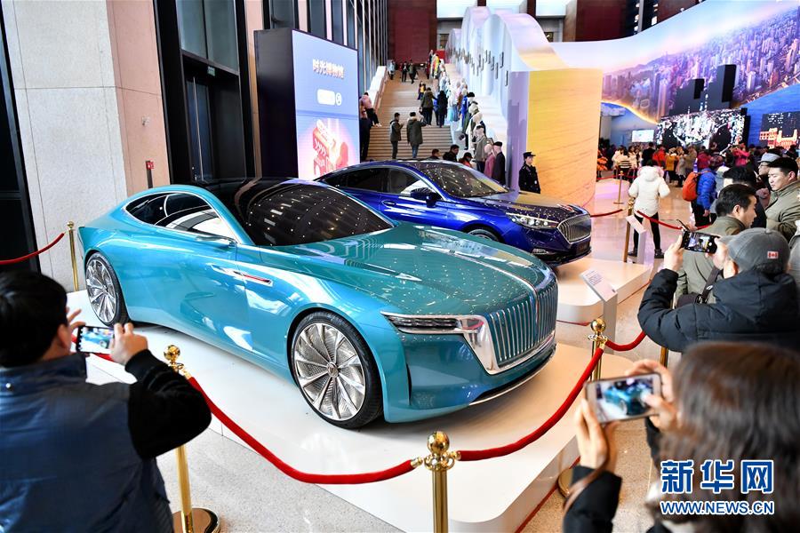 12月4日,观众在“伟大的变革——庆祝改革开放40周年大型展览”上参观红旗“E·境”概念车(左)。 新华社记者 李鑫 摄