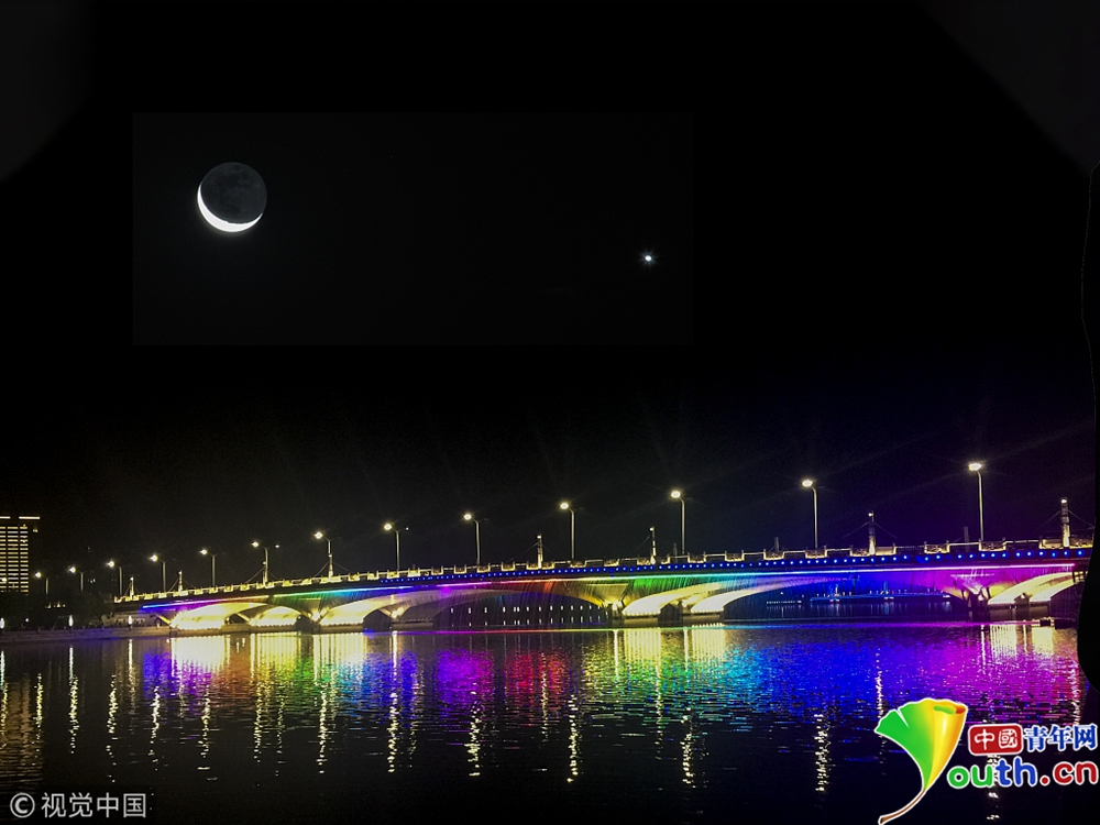 北京,天宇上演“金星合月”,清晨5点时,东南方低空出现一颗明亮的金星和一弯窄月近距离相依相伴的美丽画面。