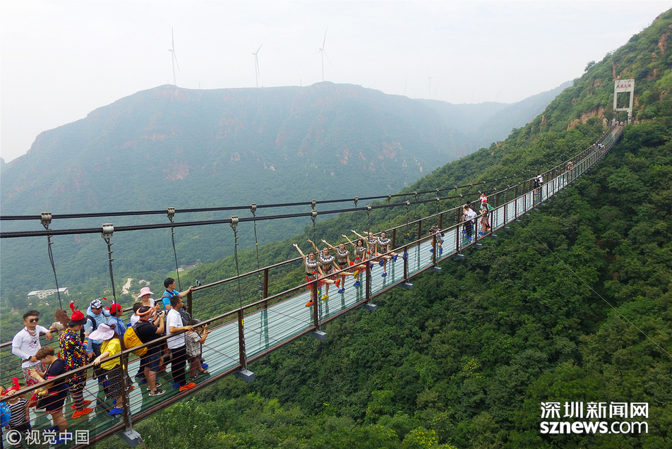 2018年6月30日,郑州新密一景区的玻璃吊桥上,几名美女大学生身穿“野人”服装练习瑜伽,吸引了众多游客的围观。据了解,这些大学生来自郑州。