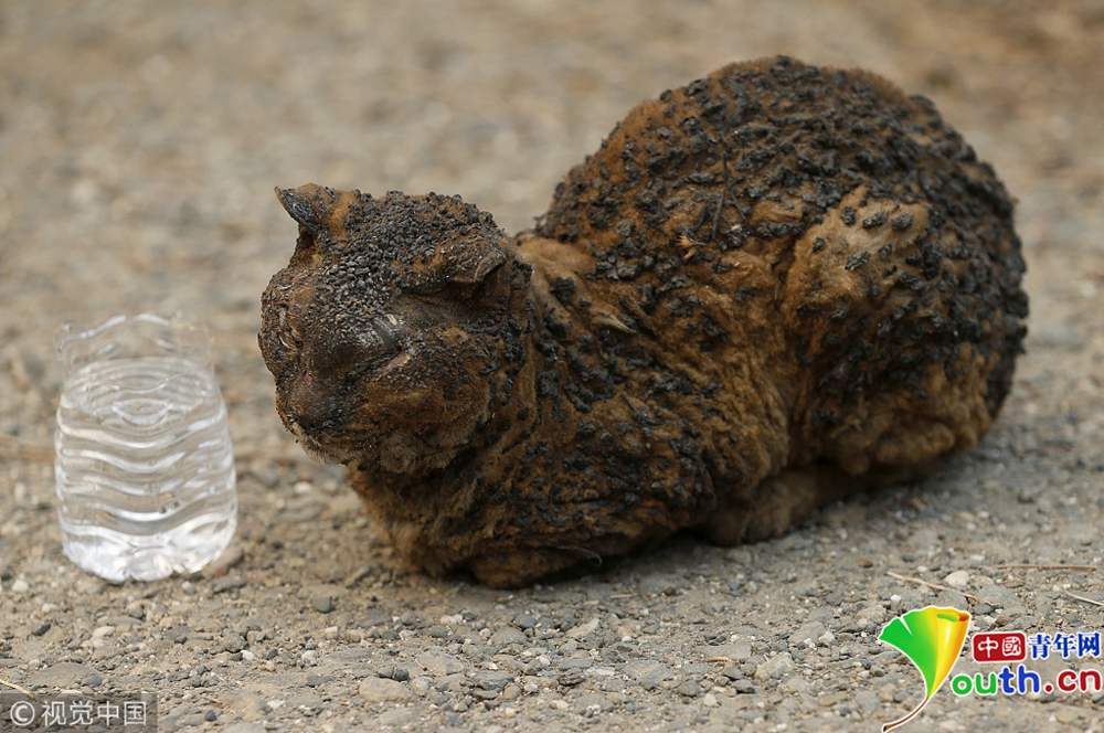 这场美国史上最严重山火导致7700多所房屋被毁,5万多人流离失所。一只被烧伤的猫在等待动物管理局到来救助。