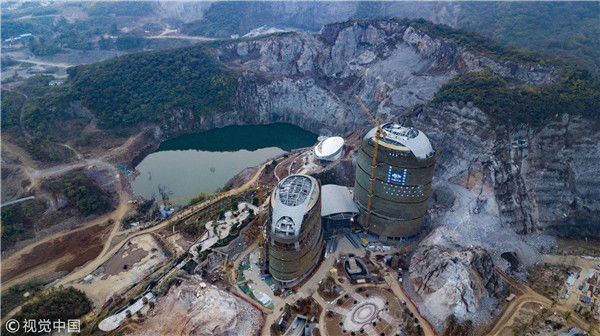 2017年11月15日,航拍南京老山一处百米悬崖边,拔地而起的在建酒店酷似两个“外星人基地”。
