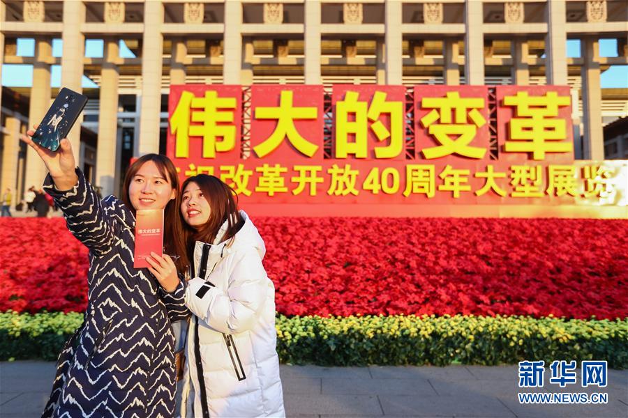 12月18日,参观者在“伟大的变革——庆祝改革开放40周年大型展览”外自拍留影。 截至当日,在中国国家博物馆举行的“伟大的变革——庆祝改革开放40周年大型展览”累计参观人数突破160万人次。 新华社记者 张玉薇 摄