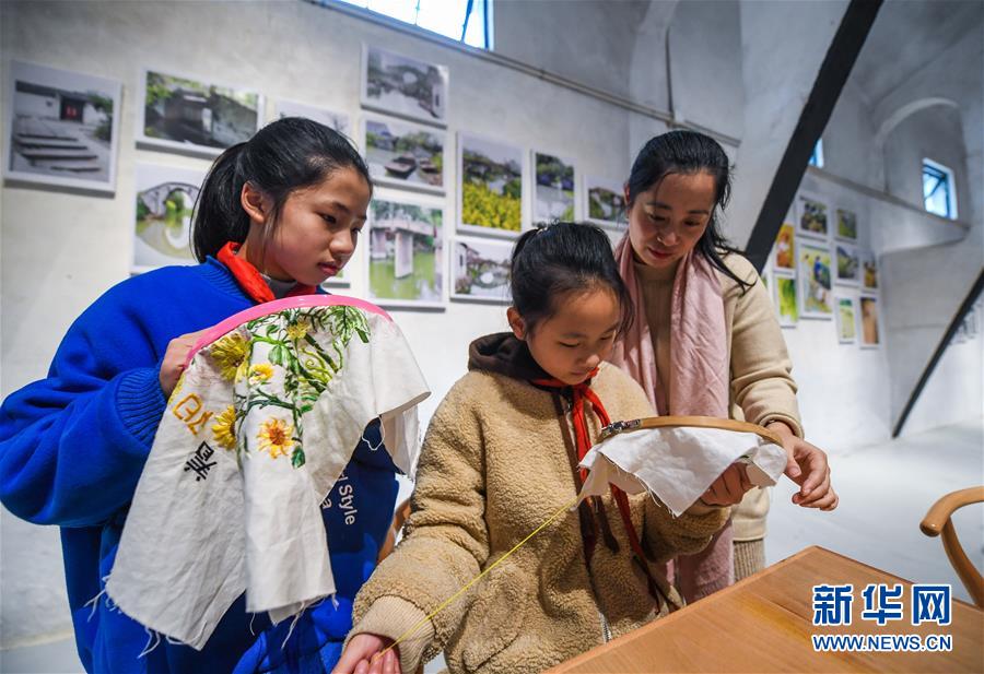 12月20日,学生在旧粮仓改建的“漾西书吧”内学习传统刺绣。 新华社记者 徐昱 摄