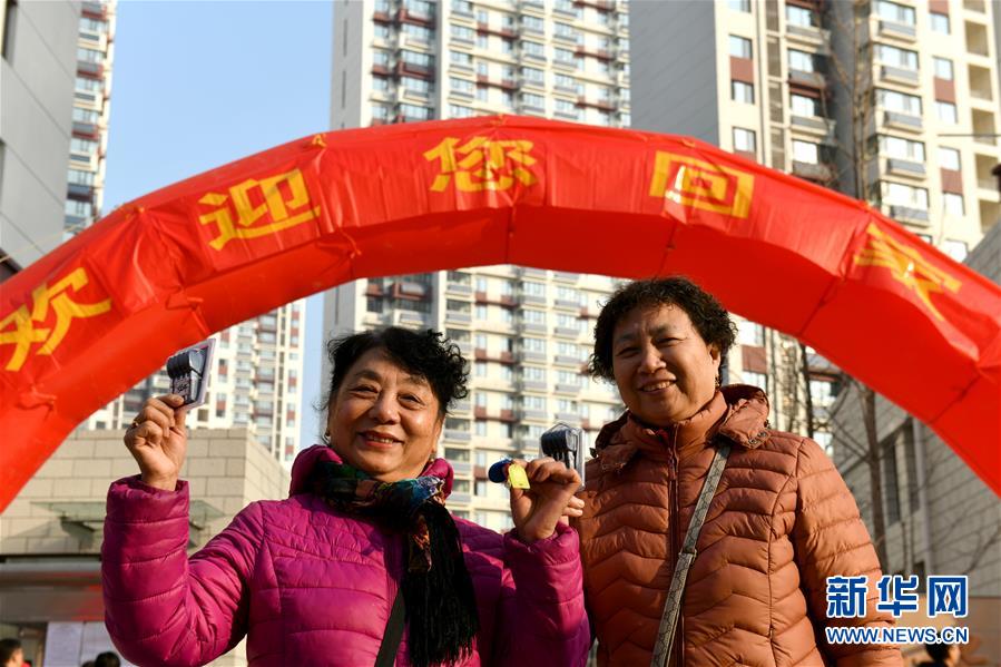 12月20日,回迁居民迟明德(中)成为和谐佳苑小区第一位办理回迁入住的居民。 当日,济南市槐荫区经十一路棚户区改造项目——和谐佳苑小区正式交付居民回迁安居。作为济南市槐荫区头号民生工程,本项目共17栋安置楼,实现棚户区居民“出棚进楼”,改善安居环境。 新华社记者 郭绪雷 摄