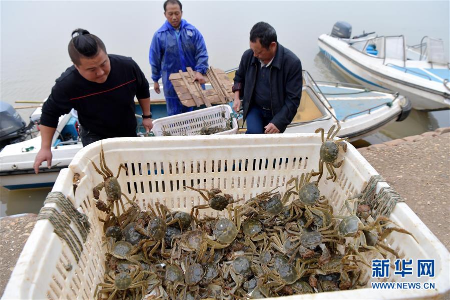 11月6日,在江西省南昌市进贤县军山湖大闸蟹养殖水域,当地水产养殖公司的工作人员将捕捞的大闸蟹搬运上岸。 新华社记者彭昭之摄