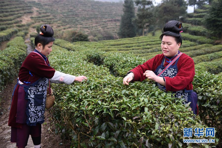 采茶工在丹寨县龙泉镇马寨村的茶园里采摘春茶(3月16日摄)。新华社记者 杨文斌 摄