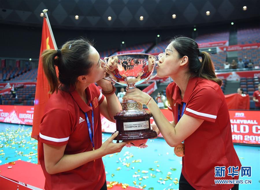 9月29日,中国队球员曾春蕾(左)和刘晓彤在颁奖仪式后亲吻奖杯。新华社记者贺灿铃摄