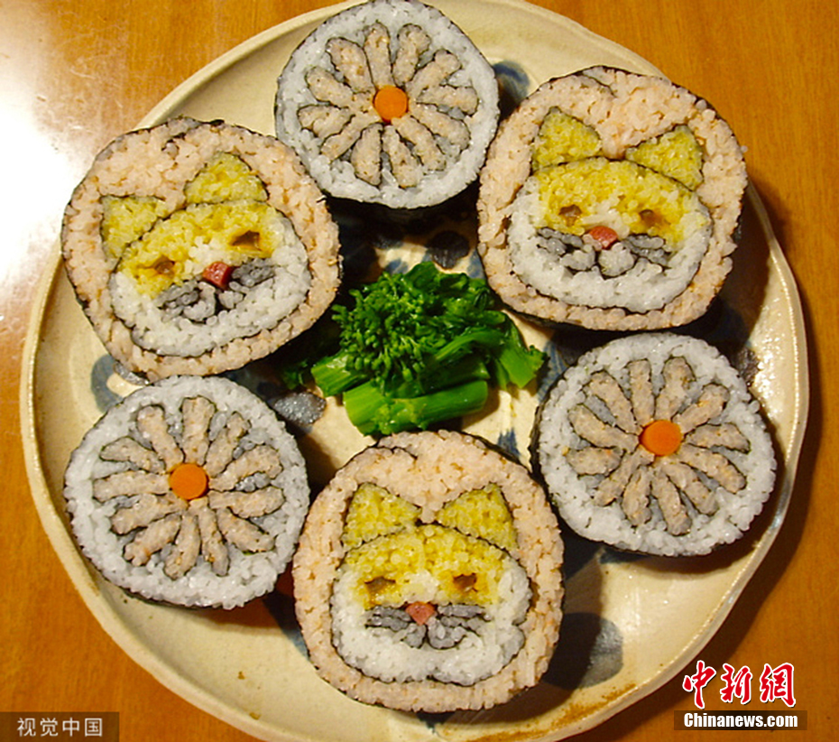 日本寿司厨师利用着色大米和海藻,制作出了猫咪、子宫中的婴儿、美人鱼以及名画。奇妙的是,不把寿司切成片,就不知道她制作的究竟是什么图案。图片来源:视觉中国