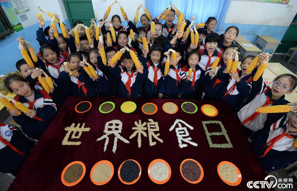 2019年10月15日,河北省邯郸市邯山区滏河学校的学生们用粮食作物拼成“世界粮食日”字样,呼吁大家爱粮节粮。图片来源:视觉中国